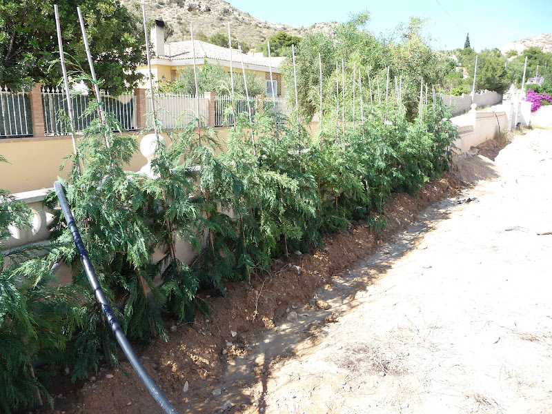 El seto de Cupressocyparis leylandii se ha plantado según la densidad prevista en proyecto, a razón de 3 pies por metro lineal. Aunque han sufrido un poco el trasplante, fundamentalmente por coincidir su colocación con la ola de calor, que acusaron bastante, ha resultado muy bien, una vez se colocó el riego hidroporoso y la abonadora.